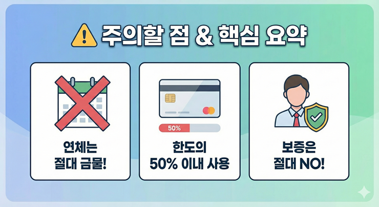- 관리법 : 모든 결제 대금(카드값, 통신비, 대출 이자)은 자동이체를 설정해 두고, 결제일 하루 전에는 반드시 잔액을 확인하는 습관을 가져야 합니다.