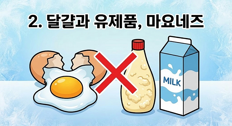 - 문제점 : 요거트, 생크림, 우유 등 유제품은 단백질과 지방 성분이 포함되어 있습니다. 냉동 시 수분은 얼고 단백질과 지방은 응고되거나 분리되면서 덩어리 지고 거친 질감으로 변합니다. 해동 후에는 원래의 부드러운 식감과 고유의 맛을 잃게 되어 먹기 힘들어집니다.